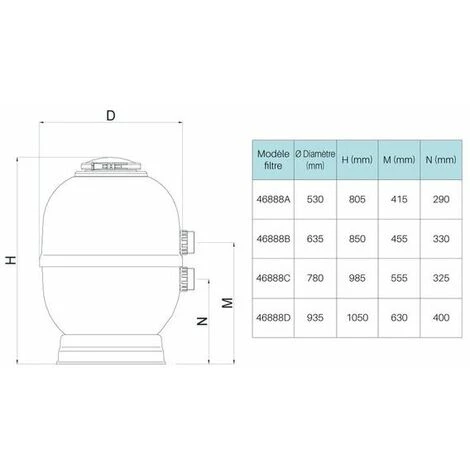 Filtre à sable Lamiperle Side Ø600. Corps en polyester et fibre de verre haute résistance. Vanne latérale 6 voies incluse. Débit 14m³/h. – – – –