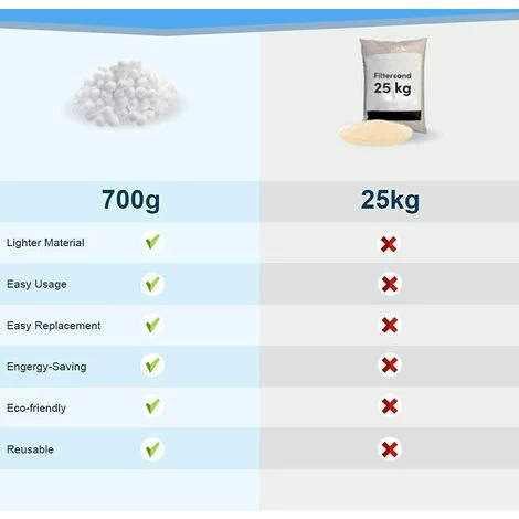 âăĂconomie d’Ă©nergieă- En raison de la capacitĂ© de filtration plus Ă©levĂ©e, le matĂ©riau filtrant requis est considĂ©rablement rĂ©duit, de sorte que 700 g de billes filtrantes suffisent pour remplacer 25 kg de sable de quartz filtrĂ©.